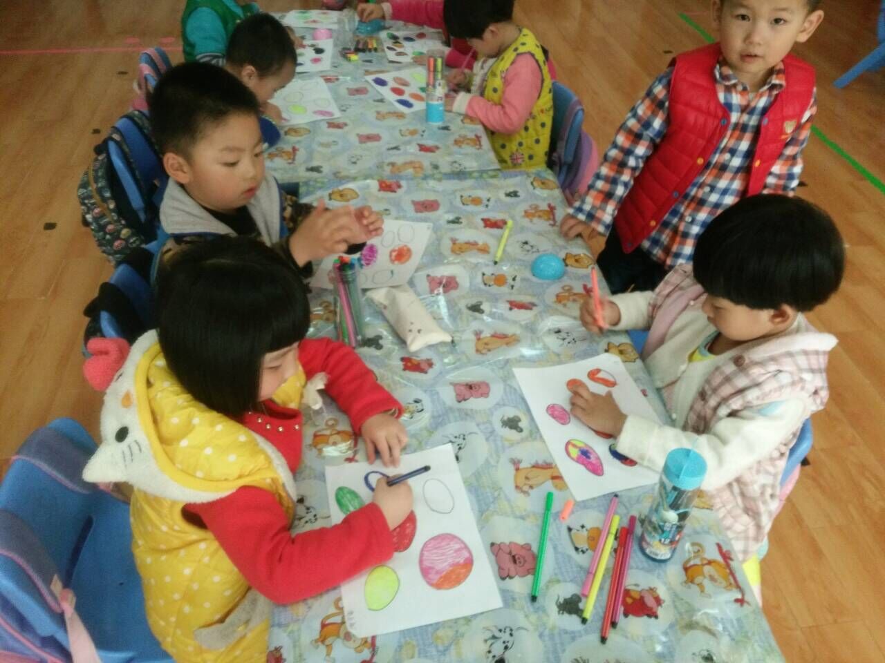 教学见习期间,同学们都非常感谢幼儿园能提供难得的见习机会,使自己在整个见习活动中提升教学经验和专业技能。进入幼儿园同学们最大感受就是老师们具有的亲和力和积极向上的饱满精神,幼儿园合理安全地利用空间,给幼儿提供了宽敞舒适安全的活动场地。楼层过道创设都由“瓶盖蝴蝶”、“中国脸谱”、“刺绣”、“节日风俗”、“卡通画像”、“运动达人”、“纽扣组合”、“手工剪纸”等主题组成的文化墙,精致又不失调皮,同学们都大开眼界。