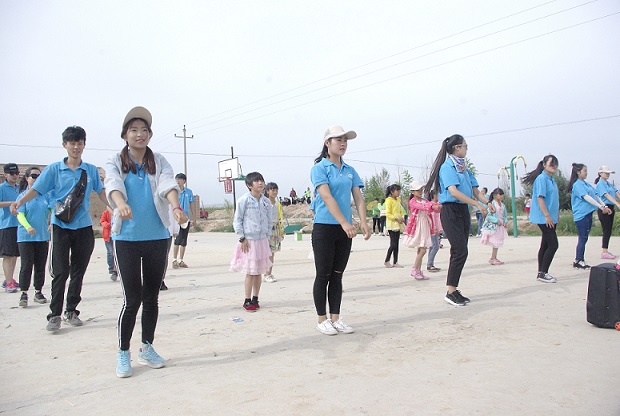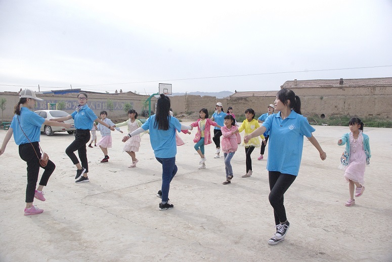 下午三点,小分队成员进过充分的准备,开始教授音乐课。不同于以往的教学模式,我们的授课地点选在村委会宽阔的院子当中,队员和孩子们手拉手的边跳边唱,在游戏中学习。朗朗歌声一遍遍的回荡在这个温馨的小村庄上空。