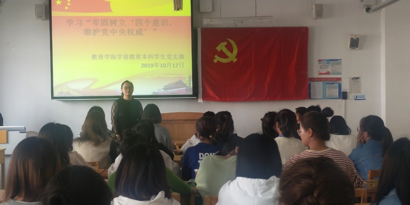 beat365在线官网入口学前教育本科员工党支部于2019年10月17日中午12点在1-504召开学习“牢固树立四个意识,维护党中央权威”主题党日活动。参加本次党日活动的有支部书记王颖,以及学前教育本科支部全体党员、预备党员。