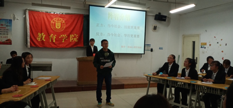 第二场比赛的参赛队伍分别是:正方数学与应用数学1班和反方心理咨询班,他们就“技能和学历哪个更重要”的主题展开了辩论。反方辩手坚持学历是敲门砖的观点紧追不放,正方辩手在千钧一发之际引出了学历只是奠基石的精彩论述而力挽狂澜。比赛进行过程中八位辩手旁征博引,妙语连珠,将理论与现实结合,充分论证了技能与学历的问题,双方针锋相对,互不相让,为大家呈现了一场有理有据的精彩辩论,经过立论陈词、攻辩阶段、攻辩小结自由辩和总结陈词五个环节环环紧扣的激战,最终数学与应用数学1班以68分的成绩获胜。