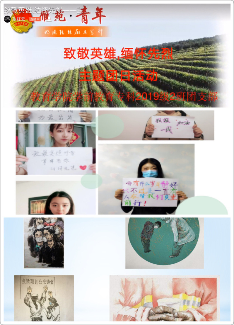 16级数学与应用数学1班团支部围绕在此次战役中人们表现出的“雷锋精神”鼓励青少年积极学习和发扬他们的优秀品质;17级学前教育专科班团支部诵读诗歌《你的样子》回顾抗役过程,向抗役英雄致敬;18级学前教育一班的同学们表示要饮水思泉,不忘来路,向无数志愿者们致敬,向“逆行者”致敬,为无数奔赴武汉捍卫生命的英雄祝福,为生命祈祷;19级学前教育专科二班团支部的同学们通制作的PPT,讲述典型事例,让同学们真真切切的感受到白衣天使们舍小家顾大家的无私奉献精神和视死如归的高尚品质,有不想当逃兵的李文亮、有坚守病房的夏思思、有“如果万一,不要插管”的刘智明、也有推迟婚期,壮烈牺牲的彭银华……还有千千万万像他们一样的烈士。无数的烈士用自己宝贵的生命,保障了人民群众的生命安全,确实如网友所说,他们不需要被神话,但需要被记住。他们为我们离开,在清明节来临之际为他们致以崇高的敬意。