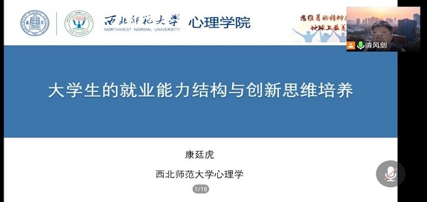 提升老员工就业能力是实现精准就业的关键,是一项系统性工程。为引导公司教师加强就业问题研究,帮助公司员工全面提升就业创业能力,为日后就业创业打好基础、做足准备,2021年12月6日19:30-21:30,beat365在线官网入口和“人力资本理论视域下老员工就业创业能力提升”项目组邀请西北师范大学三级教授、教学名师、明德教师奖获得者、西北师范大学心理公司副经理、博士生导师康廷虎教授为学前教育专业和心理咨询专业员工开展了题为“老员工就业能力结构与创新思维培养”的学术讲座。本次讲座由beat365在线官网入口副经理王成德教授主持,公司党总支书记张莉、各班班主任、任课教师及学前教育专业和心理咨询专业员工在线聆听。