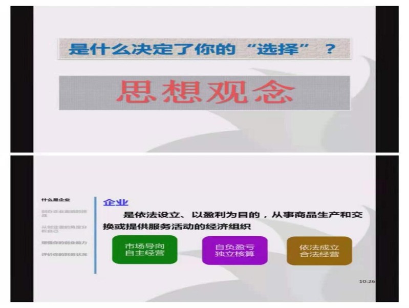 荆萌老师先以一个幸福坐标引出了今天的话话题;以溺水模式和幸福坐标来跟大家讲解了一些生活中所遇到的问题,跟大家进行互动,让大家思考自己在哪个象限?是什么决定了你的选择?接着荆萌老师以“李明的鸡场” 为例讲解了创业失败的原因,以流程图的形式讲解了如何以学习、交流、合作、借力来增强自身创业能力。