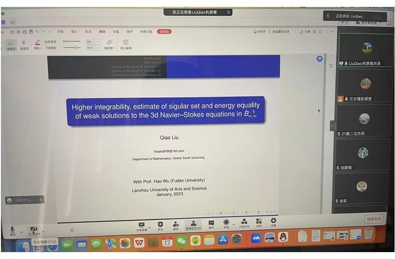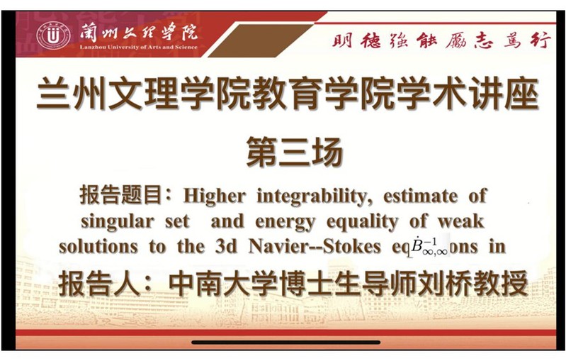 2022年12月17日,由beat365在线官网入口主办的“Higer integrability,estimate of singular set and energy equality of weak solutions to the 3d Navier-Stokes equations in ”的线上讲座,在腾讯会议顺利举办。讲座特别邀请中南大学数学与统计公司博士生导师刘桥教授主讲,公司领导班子、数学专业员工和专业教师150余人参与,讲座由副经理彭建奎博士主持。