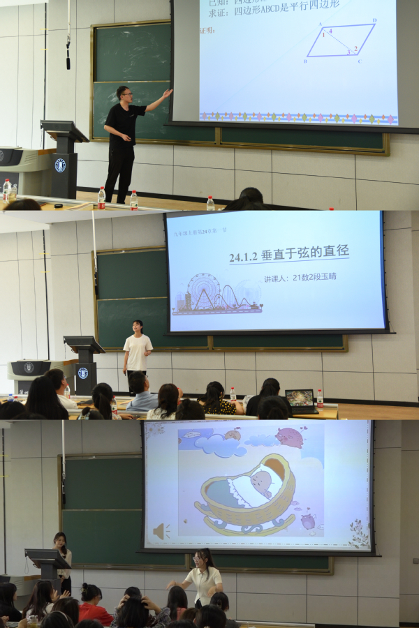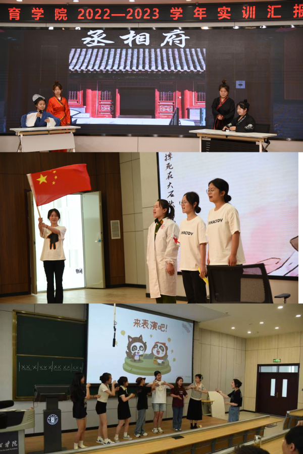 根据实训内容的不同,本次汇报分为三个场次。第一场为学前教育与小学教育专业进行童话剧、课本剧表演汇报。同学们用丰富的体态语言、生动的表情语言、富有感染力的口头语言,充满默契的合作,重现了书本中的经典形象和精彩的情节,展示了“教师语言”技能实训的效果。第二场由学前教育专业进行幼儿园五大领域主题试教汇报,展现同学们的教学设计及教学能力实训成果。第三场为数学与应用数学专业的同学们展现“三笔字”、“说课与讲课”及“教学评价与教学研究论文写作”等专业能力实训成效。各专业负责人进行了汇报点评与总结。