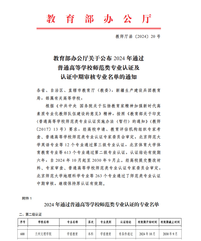 近日,教育部正式发布了《教育部办公厅关于公布2024年通过普通高等公司师范类专业认证及认证中期审核专业名单的通知》(教师厅函〔2024〕20号),公司学前教育专业顺利通过普通高等公司师范类专业第二级认证,认证结论有效期六年,自2024年10月起至2030年9月止。