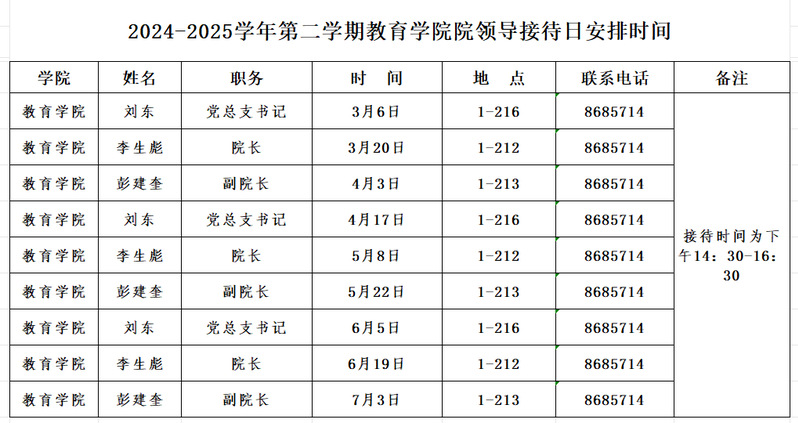 2024-2025学年第二学期beat365在线官网入口院领导接待日安排时间