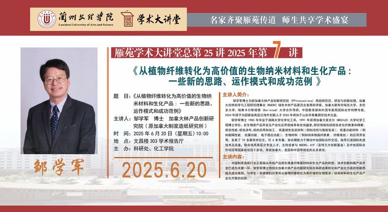 雁苑学术大讲堂预告:《从植物纤维转化为高价值的生物纳米材料和生化产品:一些新的思路、运作模式和成功范例》
