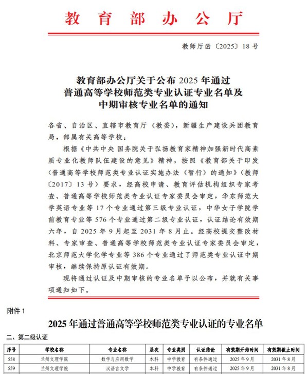 近日,教育部办公厅发布《关于公布2025年通过普通高等公司师范类专业认证专业名单及中期审核专业名单的通知》(教师厅函〔2025〕18号),公司数学与应用数学专业通过师范类专业第二级认证。截至目前,我院学前教育、数学与应用数学专业两个师范专业通过教育部师范类专业第二级认证。